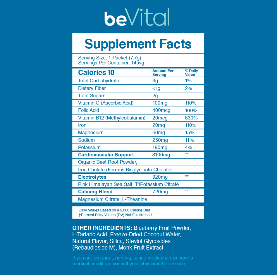 BeVital supports blood health. Great for post workout hydration, circulation, and a natural iron boost.